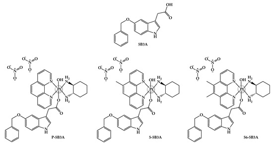 Researchers envisioned that designs based on kinetically inert octahedral platinum(IV) complexes would deliver safer, well-tolerated and effective anticancer treatment [41,42,43,44,45]. It is generally accepted that platinum(IV) complexes are the likely chemotherapeutic replacements for their equivalent platinum(II) parent complexes because of their kinetic inertness and potential for bioactive functionalisation. Commonly, platinum(IV) complexes are prepared by oxidation of the platinum(II) precursors with hydrogen peroxide [46,47]. This synthetic step generates the platinum(IV) scaffold, incorporating two axial positions with two hydroxides coordinated and readily available for substitution by bioactive ligands. While cisplatin, carboplatin and oxaliplatin are being exploited as precursor cores for new platinum(IV) complexes [48,49,50,51], we contribute to this approach by utilising the potent platinum(II) complexes, PHENSS, 5MESS and 56MESS. With the vast number of bioactive ligands available to coordinate to platinum(IV), the indole-based derivative, 5-benzyloxyindole-3-acetic acid (5B3A) caught our interest. We have selected 5B3A as axial ligand because it incorporates an indole pharmacophore, which has been used in drug design and discovery [52,53]. The bicyclic nature of the compound exhibits multiple therapeutic properties [54,55]; and for this reason, it is found in many drugs, specifically those that target cancer [56]. Recent studies have also shown the effective use of the indole scaffold in creating new metal-based anticancer drugs with improved activity [57,58]. We expect that by coordinating 5B3A to the platinum(IV) form of PHENSS, 5MESS and 56MESS, we will enhance the anticancer properties by providing an additional mode of action against cancer cells.