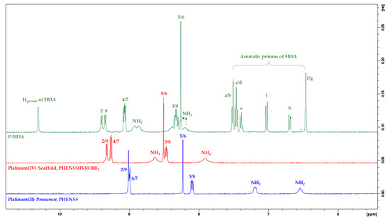 When comparing the multiplicities demonstrated for P-5B3A in the aromatic region with the multiplicities for its corresponding platinum(II) precursor and platinum(IV) scaffold, PHENSS and PHENSS(IV)(OH)2, slight variations are evident as shown in Figure 6. Upon coordinating 5B3A to the platinum(IV) scaffold, PHENSS(IV)(OH)2, an upfield shift was detected for the following phen protons: H4, H7, H3, H8, H5 and H6 (Figure 6). This phenomenon may have been caused by the possible π–π stacking interactions between the aromatic rings of 5B3A and the phen, and this upfield movement was also observed by structurally related complexes in the literature [59,61]. Overall, the variations in multiplicity reported for P-5B3A is primarily influenced by the coordination of the axial ligand, 5B3A.