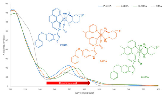 Based on the UV spectra of P-5B3A (Figure 7 and Figure S21), a prominent absorption band was detected at 204 nm, which was followed by a dip between ~240 and 250 nm, denoting a hypochromic shift. Subsequently, a hyperchromic shift was observed when a less prominent peak appeared at 279 nm, which was followed by a weak band between 300–310 nm, as shown in Figure 7. The absorption bands detected for P-5B3A were also evident in the UV spectra of 5-5B3A and 56-5B3A (Figure 7, Figure S22 and Figure S23). Moreover, the absorptions bands shifted towards a longer wavelength, which indicates bathochromic shift. Interestingly, a characteristic band was observed for 56-5B3A between ~240 and 250 nm which appears like a weak shoulder. Finally, it is also noteworthy that the characteristic absorption bands for uncoordinated 5B3A are evident within the absorption bands for the complexes (Figure 7). This provides further evidence of the contributions of 5B3A when coordinated to platinum. Overall, the UV spectra demonstrated by P-5B3A, 5-5B3A, 56-5B3A also show evidence of the presence or lack of methyl groups on the heterocyclic ligands.