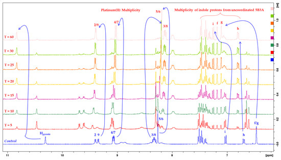 The expanded 1H-NMR reduction spectra for P-5B3A at different time intervals showing distinct changes in chemical multiplicity are highlighted in Figure 8. The separate doublets exhibited by H2 and H9 protons and the multiplet exhibited by H4 and H7 protons (in the platinum(IV) form) resolved into a doublet (Figure 8). Subsequently, an upfield shift was observed for H3, H8, H5 and H6 protons. Notably, the Hpyrrole of the axial ligand, 5B3A appeared further downfield at 10.8 ppm upon dissociating from platinum. Another notable change in multiplicity was demonstrated by the indole protons, f and g. As shown in Figure 8, these protons resonated as a singlet at 6.46 ppm (in the platinum(IV) form), but eventually resolved into two separate singlets as it dissociated from the platinum. These changes in multiplicity show that the platinum(IV) complex, P-5B3A successfully reduced to its core platinum(II) precursor, PHENSS. To further confirm this, 1D-195Pt-NMR measurements were performed at 37 °C at 400 and −2800 ppm immediately after the final 1H-NMR measurement. At approximately 1.5 h, the 1D-195Pt-NMR reduction spectra of P-5B3A was acquired and no platinum(IV) peak was found at 400 ppm, as shown in Figure S32. However, at −2800 ppm, 30 min after the first 1D-195Pt-NMR reduction spectra were acquired, a prominent peak was recorded, which indicates the presence of the platinum(II) precursor, PHENSS (Figure S32). The changes in multiplicity observed in the 1H-NMR reduction spectra of P-5B3A (Figure 8 and Figure S31) were comparable to those observed for 5-5B3A and 56-5B3A (Figures S33 and S35). 5-5B3A and 56-5B3A were also confirmed to have successfully reduced to their core platinum(II) precursors, 5MESS and 56MESS, respectively, based on the acquired 1D-195Pt-NMR reduction spectra (Figures S34 and S36). Because P-5B3A, 5-5B3A and 56-5B3A are reduced to their core platinum(II) precursors, this further confirms that they are prodrugs.