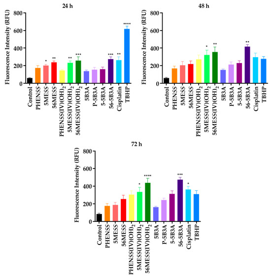 ROS production upon treatment with P-5B3A, 5-5B3A and 56-5B3A, 5B3A, and cisplatin in HT29 colon cells at 24, 48 and 72 h. The RFU values reported for platinum(II) precursors (PHENSS, 5MESS and 56MESS) and platinum(IV) scaffolds (PHENSS(IV)(OH)2, 5MESS(IV)(OH)2 and 56MESS(IV)(OH)2) were acquired from the literature for comparison [59,61,65].