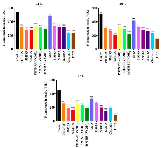 Because the majority of ROS is generated in the mitochondria [78,106], it was appropriate to assess any mitochondrial activity changes upon treatment with the synthesised platinum(IV) complexes, P-5B3A, 5-5B3A and 56-5B3A. This was achieved by determining if the overproduction of ROS induced by these complexes impacts mitochondrial activity by altering MtMP. Briefly, there is evidence showing a strong correlation between increased levels of ROS and mitochondrial impairment [106,107,108,109,110]. We determined MtMP changes induced by P-5B3A, 5-5B3A and 56-5B3A, 5B3A, the platinum(II) precursors (PHENSS, 5MESS and 56MESS), the platinum(IV) scaffolds (PHENSS(IV)(OH)2, 5MESS(IV)(OH)2 and 56MESS(IV)(OH)2), and cisplatin in HT29 colon cells at different time intervals: 24, 48 and 72 h (Table 8 and Figure 10 and Figure S41). The MtMP changes recorded are measured as RFU. Relative to the control, a lower or greater RFU is indicative of mitochondrial dysfunction caused by unstable MtMP.