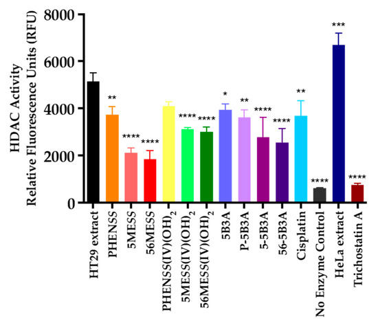 We determined the inhibition of HDAC activity by P-5B3A, 5-5B3A and 56-5B3A, 5B3A, the equivalent platinum(II) precursors (PHENSS, 5MESS and 56MESS) and platinum(IV) scaffolds (PHENSS(IV)(OH)2, 5MESS(IV)(OH)2 and 56MESS(IV)(OH)2), together with cisplatin in HT29 colon cells at 72 h (Table 9 and Figure 11 and Figure S42). All values are expressed as RFU. Relative to the HT29 extract (control), a lower RFU value corresponds to a decline in HDAC activity.