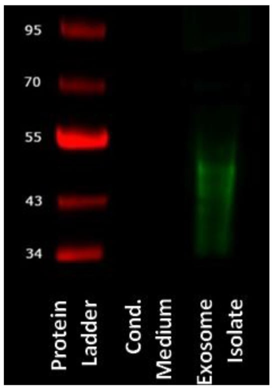 The gold standard for exosome isolation is ultracentrifugation []. Lacking the necessary equipment, we have utilized a method based on magnetic beads. Exosomes were successfully isolated from ADSC-conditioned cell culture medium, as confirmed with immunodetection (Figure 1). CD63 is a marker for exosomes, although it has also been detected on the surface of other vesicles [,]. However, when separated electrophoretically, exosomes show a size range between 30 kDa and 60 kDa [,], matching the size of the particles detected with our Western blot.