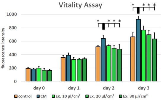 Cell viability was tested using a resazurin assay for MCF-7 cells treated with conditioned medium and medium supplemented with exosomes (ES) in the concentrations 10 µL/cm2, 20 µL/cm2, and 30 µL/cm2. Normal growth medium served as control. In comparison to the conditioned medium, the ES (exosome-supplemented) medium shows a concentration-dependent negative effect on MCF-7 cell viability. However, in the tested concentrations, no significant negative effect in comparison to the control medium can be seen (Figure 2). ADSC-conditioned medium has a positive effect on MCF-7 cell viability. In comparison to the conditioned medium, the ES medium in all tested concentrations and the control medium show a significantly reduced cell viability on day 2 and day 3 (p-value < 0.05).