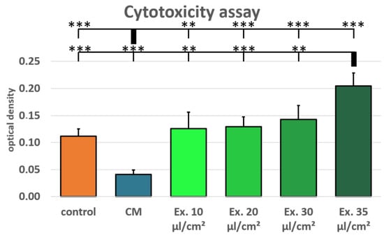 LDH assay for cytotoxicity detection. Mean values and standard derivations are shown. Both the conditioned medium (CM) and the 35 µL/cm2 exosome supplementation (Ex. 35 µL/cm2) differ highly significantly from all other groups (** p-value < 0.01; *** p-value < 0.001).