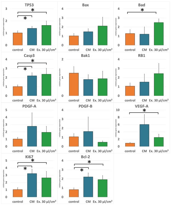 RT-PCR for gene expression. Gene expression of MCF-7 cells after treatment with ADSC-conditioned medium or medium supplemented with 30 µL/cm2 of exosome isolate was tested for genes related to apoptosis, angiogenesis, or proliferation. Generally, expression of pro-apoptotic genes was higher in cells treated with the exosome medium compared to the cells treated with the conditioned medium. For anti-apoptotic gene Bcl-2, angiogenesis promoting genes VEGF-A, PDGF-A, and PDGF-B, and the proliferation marker Ki67, expression was higher in cells treated with the conditioned medium compared to the exosome medium. However, not all differences were statistically significant (* p-value < 0.05). Mean values and standard derivations are shown.