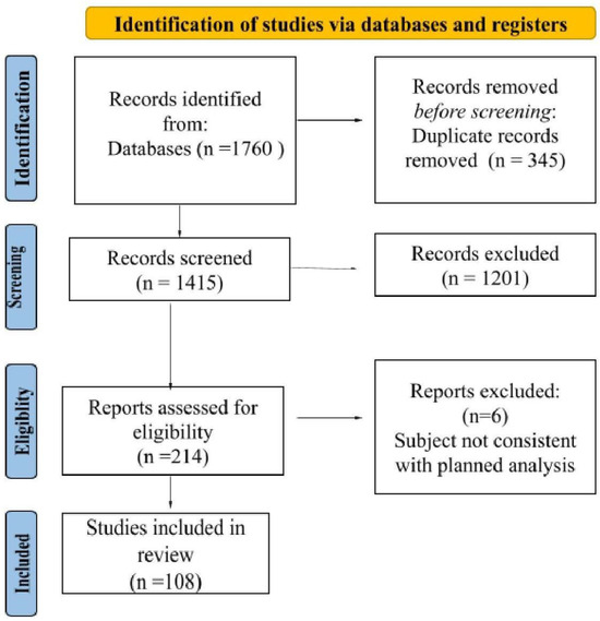 Of the 1760 identified in PubMed records, 1415 were screened, 214 were retrieved and assessed for eligibility, and 108 were finally included in the review. The entire selection process is illustrated in Figure 1. The main features of the original articles on the topic under study are summarized in Table 1 and Table 2.