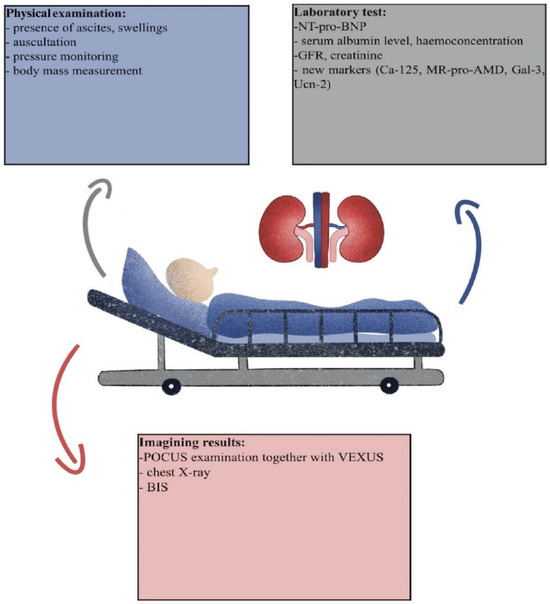 Gal-3 appears to be more responsive to kidney failure and mortality rate than OH itself but shows a precise correlation during the clinical and pre-clinical studies as an organ failure indicator. Ucn-2 is a protein sensitive to vasodilation due to an increase in fluid volume but it gives diverse results when considered as a strict OH marker. Volume status can also be assessed with imaging methods. POCUS (point-of-care ultrasonography) allows the observation of the signs of OH, such as the presence of fluid in the pleura or peritoneum; higher diameter of the jugular vein; IVC (inferior vena cava); abnormal flow through the hepatic vein, portal vein, or renal vein; and estimation of pressure within these structures [39]. A specific protocol called the Venous Access Ultrasound Score (VEXUS) has also been developed and validated.