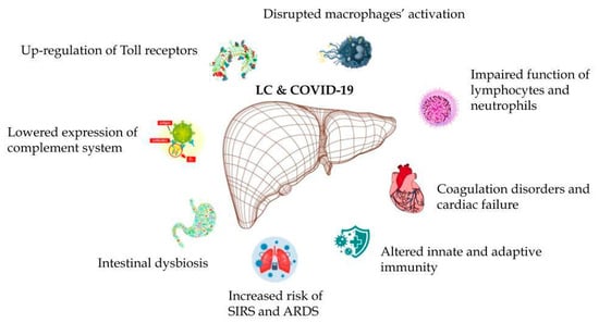 The perspective of four years of the pandemic due to coronavirus infection gave us a deep insight into its course and possible implications. Undoubtedly, we are still facing new findings in this field. Nevertheless, with the rapidly increasing number of new COVID-19 cases, our knowledge became more detailed—even in the area of hepatology. Because of the significant prevalence of CLD worldwide (112 million people according to the Global Burden of Disease (GBD) Study from 2017), the observation of the direct influence of coronavirus infection on its course is of crucial importance [,,,,]. According to available data, it can be assumed that liver involvement is not a typical occurrence in COVID-19 patients and if it develops, usually, the course of liver injury is mild and transient, with no need for pharmacological treatment. Nonetheless, the situation becomes more complicated among individuals with pre-existing hepatic disorders—mainly non-alcoholic fatty liver disease (NAFLD), MAFLD and cirrhosis [,,]. On the other hand, previously diagnosed viral hepatitis was not found as a triggering factor for liver damage after being infected with the coronavirus []. According to global data, the overall risk of a severe course and death because of COVID-19 in patients with CLD becomes 2.44 times greater in comparison to the population with no hepatic problems [,,]. The global multicenter experience (the United States, Europe and China) with cirrhotic patients treated due to SARS-CoV-2 infection gives the perspective of the significantly higher mortality rate among these individuals (up to 35%) compared to the non-cirrhotic population [,,]. According to the latest analyses of data, even though the results of observations seem to be conflicting, cirrhosis is predominantly described as an independent factor increasing mortality due to coronavirus infection []. Therefore, the basic status of liver function related to infection with SARS-CoV-2 should be perceived as an important parameter in the case of COVID-19 [,]. How about the exact explanation of the notable involvement of cirrhosis in the presentation of COVID-19? The most probable scenario concerns immunological disturbances observed in cirrhotic patients. Dysregulation of innate and adaptive immunity may be followed by the greater susceptibility to developing ARDS and SIRS—phenomena which constitute natural sequelae of coronavirus infection. Moving further, cirrhotic patients are characterized by: intestinal dysbiosis, altered lymphocytes together with neutrophil function, Toll-like receptor upregulation, impaired macrophage activation and decreased expression of the complement system [,,,,,]. Figure 1 presents cirrhosis-related immunological disorders triggering the course of COVID-19.