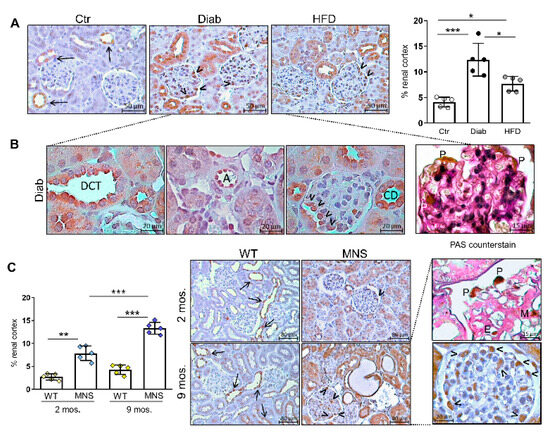 Immunostaining for full length-(pro)renin receptor (FL-(P)RR). Immunohistochemical (IHC) detection of FL-(P)RR and relative quantification of staining in renal specimens from control (Ctr), diabetic (Diab), and high fat diet (HFD) mice (A), and characteristics of the staining pattern in kidneys of Diab mice (B). IHC detection of FL-PRR, quantification, and immunostaining pattern in Wistar (WS) and Milan normotensive strain (MNS) rats at two and 9 months of age (C). Higher magnification images of IHC for FL-PRR in kidneys of Diab mice and 9-month-old MNS rats, counterstained or not with PAS, are shown in panels (B) and (C), respectively. Bars represent mean ± SD and each dot in (A,C) represents an individual animal. Arrows indicate positive cells in the tubular compartment, while arrowheads indicate glomerular cells with morphological features and topographical localization characteristic of podocytes. DCT, distal convoluted tubule; A, arteriole; CD, collecting duct; P, podocyte; M, mesangial cell; E, endothelial cell. Post hoc multiple comparison: *** p < 0.001, ** p < 0.01, * p < 0.05.