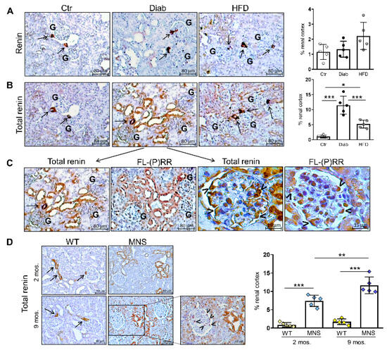 Immunostaining for (pro)renin (total renin). Immunohistochemical (IHC) detection of renin without (A) and after (B) pretreatment with trypsin in sequential sections, and relative quantification of staining in renal specimens from control (Ctr), diabetic (Diab), and high fat diet (HFD) mice. The IHC detection of full length-(pro)renin receptor (FL-(P)RR) in a sequential section of the same kidney specimens, as depicted in panel B, reveals co-localization with total renin positivity at both tubular and glomerular levels (C). IHC detection of total renin and relative quantification of staining in renal specimens of Wistar (WS) and Milan normotensive strain (MNS) rats at two and 9 months of age (D). Bars represent mean ± SD and each dot in (A,B,D) represents an individual animal. Arrows indicate positive staining within juxtaglomerular areas, while arrowheads indicate glomerular cells with morphological features and topographical localization characteristic of podocytes. G, glomerulus. Post hoc multiple comparison: *** p < 0.001, ** p < 0.01, * p < 0.05.