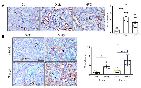 Immunostaining for cyclooxygenase-2 (COX-2). Immunohistochemical detection of COX-2 and relative quantification of staining in renal specimens from control (Ctr), diabetic (Diab), and high fat diet (HFD) mice (A), and in Wistar (WS) and Milan normotensive (MNS) rats at two and 9 months of age (B). Bars represent mean ± SD and each dot in (A,B) represents an individual animal. Arrows indicate positive staining of macula densa cells, while arrowheads indicate glomerular cells with morphological features and topographical localization characteristic of podocytes. G, glomerulus. Post hoc multiple comparison: *** p < 0.001, * p < 0.05.