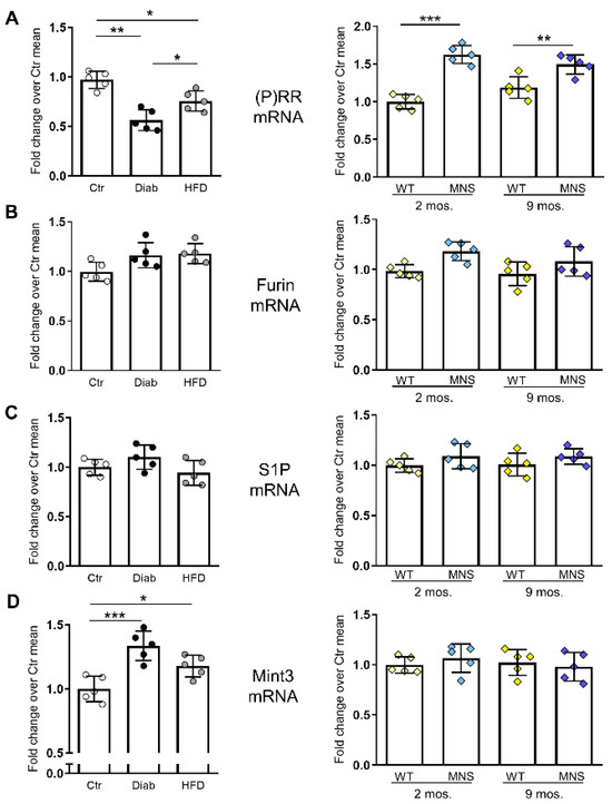 To investigate the potential mechanism contributing to the disparity between mRNA and protein changes in Diab and HFD mice, as well as between the mouse models and the rodent model of renal damage, we analyzed the mRNA expression of site-1 protease (S1P) and furin, the primary proteases involved in the intracellular cleavage of FL-PRR and the formation of sPRR [24,25]. RT-PCR analysis did not reveal any differences in gene expression of the proteases in any of the three rodent models (Figure 4B,C). We also assessed the gene expression of Munc18-1 interacting protein 3 (Mint3), an adapter protein involved in the regulation of furin activity [26], and found increased mRNA levels in Diab mice and, to a lesser extent, HFD mice, but not in MNS rats, compared to the respective controls (Figure 4D).