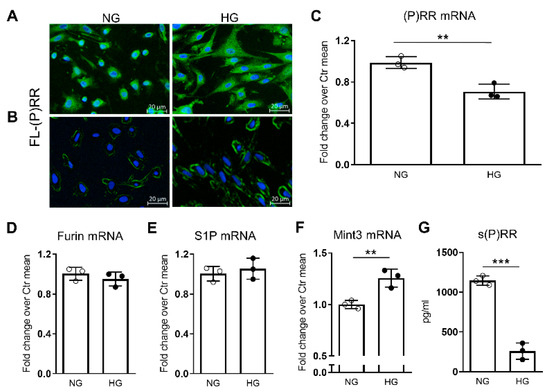 If performed without cell membrane permeabilization using Triton X-100 pretreatment, the immunostaining revealed accentuation on the plasma membrane in podocytes treated with HG (Figure 5B). In contrast, (P)RR gene expression was decreased in podocytes cultured in HG conditions compared to podocytes cultured in normal glucose (NG) conditions (Figure 5C). As observed in the kidneys of Diab mice, HG levels did not modify the mRNA levels of the proteases furin and S1P, but induced an upregulation of the adapter protein Mint3 (Figure 5D–F). In parallel with these molecular changes and the modified cellular distribution of FL-(P)RR, HG induced a reduction in the formation and secretion of soluble (s)PRR. This was evidenced by a notable decrease in its levels within the culture medium (Figure 5G).