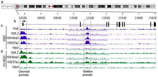 Epigenetic landscape of the TEAD4-gene-encoding locus in permanent cell lines. (a) Human chromosome 12. The vertical red line indicates the precise location of the TEAD4 gene on the chromosome. (b) Exon/intron structure of TEAD4 gene. The diagram indicates the exons by the thick vertical lines and the intronic regions by the thin horizontal lines. The direction of transcription is indicated by the arrow. The epigenetic histone and Pol2 ChIP-Seq profiles are shown for the K562 (c) and H1-hESC (d) cell lines.