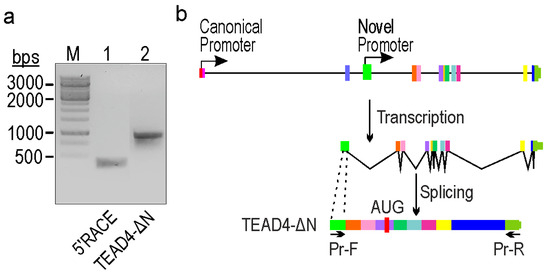 Identification of a novel TEAD4-isoform-encoding mRNA transcribed from an alternative intronic promoter. (a) 5′RACE analysis of the TEAD4 gene (lane 1) and the amplicon of the truncated form of the TEAD4 gene (lane 2). (M = Molecular weight marker). (b) TEAD4 gene’s exon/intron structure (exons are indicated by thick vertical lines of different colors; introns are indicated by thin horizontal lines), transcription, and splicing processes involved in the generation of the TEAD4-ΔN isoform. Pr-F and Pr-R indicate the position of the PCR primers used in the amplification of the novel transcript.