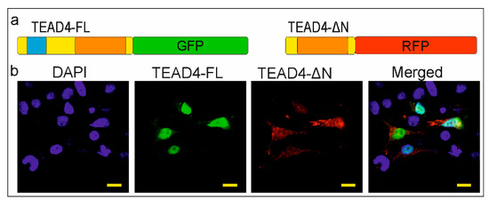 Several mechanisms have been described for regulating the subcellular localization of proteins. For instance, the nuclear localization signal (NLS) of NF-κB is covered by specific inhibitory proteins that prevent its constitutive entry into the nucleus [27]. However, proteins with no NLS can still fulfill their regulatory function through NLS-independent nuclear localization in cells [28]. The removal of the DNA-binding domain poses an interesting question about the cellular and molecular function of the TEAD-ΔN isoform. NLS prediction software (NLStradamus 1.0) could not detect this kind of sequence in the truncated TEAD4 isoform. Experimental evidence was sought to determine the location of the isoform. Our hypothesis was that identifying the subcellular localization of this isoform could provide insight into its potential function. Therefore, both isoforms were cloned into plasmids encoding fluorescent proteins. The full-length TEAD4 isoform (TEAD4-FL) was cloned into a plasmid expressing GFP (green fluorescent protein), while TEAD4-ΔN was cloned into a plasmid expressing RFP (red fluorescent protein). The recombinant plasmid constructs were transiently co-transfected into eukaryotic cells. The full-length isoform of TEAD4 (TEAD4-FL) was found exclusively in the nuclei, whereas the truncated form (TEAD4-ΔN) was mainly present in the cytoplasm (Figure 4). The cytoplasmic location of the isoform with a truncated DNA-binding domain may affect the regulation of the Hippo signaling pathway, as discussed later.