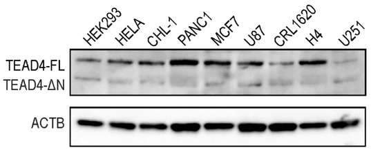 Expression levels of the TEAD4 proteins in cell lines. The expression pattern of full-length TEAD4 (TEAD4-FL) and truncated TEAD4 isoforms (TEAD4-ΔN) was detected by Western blotting. Human actin beta (ACTB) was used as a loading control.