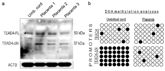 Protein expression and DNA methylation analyses were performed on human placental samples. (a) Western blot analysis of the expression of the TEAD4 isoforms in umbilical cord and three different placental samples. ACTB was used as a loading control. (b) Bisulfate sequencing analyses of TEAD4 promoters. Open circles represent unmethylated CpGs, while closed circles are methylated CpGs.