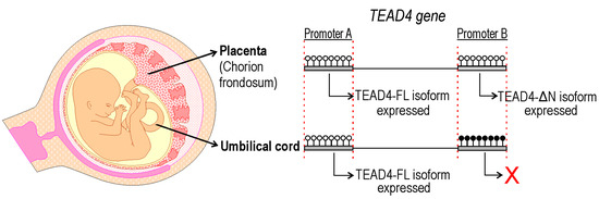 Epigenetic signals including DNA methylation and various histone modifications generate a chromatin milieu that sets the stage for efficient transcription. As a next step, we examined the probable epigenetic regulatory mechanisms underlying selective TEAD4 isoform expression. We conducted DNA methylation studies, including bisulfite sequencing, on genomic DNA samples isolated from umbilical cords and placentas. Our epigenetic studies were focused on revealing the DNA methylation status of the two TEAD4 promoters (i.e., the canonical and the alternative one), which might provide an explanation for the observed protein expression differences. The bisulfite sequencing data is consistent with the observed protein expression pattern. The canonical TEAD4 promoter is not methylated in either the umbilical or placental samples, allowing for uniform TEAD4 protein expression in these tissues. The promoter of the truncated isoform is heavily methylated in umbilical samples, resulting in impaired transcription, and, accordingly, there is no expression of the TEAD4-ΔN isoform in such samples, explaining the protein expression pattern detected by Western blotting.