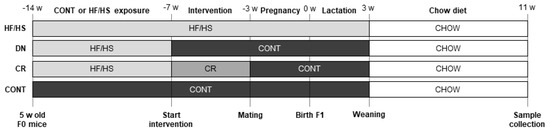 The animal procedures were performed in accordance with the relevant guidelines and regulations. Five-week-old female outbred Rj:Orl Swiss mice were fed ad libitum HF/HS (n = 18) or CONT (n = 6) diet for 7 weeks. The HF/HS diet was composed of 60 kJ% fat (from beef tallow), 20kJ% carbohydrate, and 20kJ% protein (Ssniff (Soest, Germany) E15741-34; corresponding to Research Diets D12492) and 20% (w/v) fructose (Merck (Hoeilaart, Belgium), 102109450) was added to the drinking water. CONT was a matched purified control diet and this was composed of 10 kJ% fat, 70kJ% carbohydrate, and 20 kJ% protein (Ssniff E157453-04; corresponding to Research Diets D12450J). CONT mice received water ad libitum. After these 7 weeks, HF/HS-fed mice were split into 3 groups, which received a different diet in the next 4 weeks: HF/HS, DN, and CR. In the HF/HS group (n = 6), the mice were maintained on an ad libitum HF/HS diet. In contrast, the mice of the DN group (n = 6) were switched to an ad libitum CONT diet. Finally, the CR mice (n = 6) received the same CONT diet but only 70% of the amount that was consumed in the CONT group (calculated based on daily consumption, paired feeding regimen). CONT mice (n = 6) were maintained on the ad libitum CONT diet. Ultimately, this resulted in 4 treatment groups: HF/HS, DN, CR, and CONT. Then, all mice were mated with CONT-fed Rj:Orl Swiss males (n = 6) in a crossover design (i.e., each male is used in every group) and maintained on their diets during pregnancy and lactation, except CR who switched to the ad libitum CONT diet. After weaning at 3 weeks, F1 mice were kept on a standard chow diet for 8 weeks (Figure 1). At birth (0 weeks), litter sizes were counted and all mice were weighed collectively per litter. At weaning (3 weeks) and adult age (8 weeks and 11 weeks), all female mice were weighed individually.