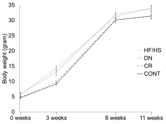 At birth (0 weeks), all pups were weighed collectively per litter. At weaning (3 weeks) and adult age (8 weeks and 11 weeks) all female mice were weighed individually. At birth, no significant differences in total litter weight were observed between the groups (p > 0.05). At weaning, body weight was significantly increased in HF/HS compared to CONT (p < 0.001). CR was able to alleviate this increase in HF/HS (p = 0.001) and restore this to the level of CONT (p = 1), while DN was not significantly different from HF/HS (p = 1). At 8 weeks and 11 weeks, again, no significant differences were observed between the treatment groups (p > 0.05) (Figure 2).