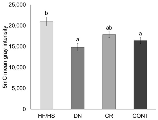 Oocyte global DNA methylation levels were determined using 5-methylcytosine (5mC) immunostaining. We found that 5mC mean gray intensity was increased in HF/HS compared to CONT (p = 0.003). Compared to HF/HS, global DNA methylation levels are decreased in DN (p < 0.001) but not in CR (p = 0.191). Compared to CONT, global DNA methylation levels from both DN (p = 0.576) and CR (p = 0.842) were not significantly different (Figure 4).