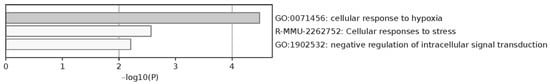 Finally, pools of oocytes from all mice of the same litter were analyzed using Ion Mobility Spectrometry–Time-Of-Flight (TIMS-TOF) shotgun proteomic analysis. When all treatment groups were compared, one cluster of 17 differentially regulated proteins (DRPs) was observed, which contained a pattern where these proteins were downregulated in the HF/HS group compared to CONT. The DN group was similar to CONT, while, in CR, some proteins were also downregulated compared to CONT. The pathways in which the downregulated DRPs were enriched are cellular response to hypoxia, cellular response to stress, and negative regulation of intracellular signal transduction (Figure 5). The DRPs included proteasome inhibitor subunit 1 (Psmf1; plays an important role in proteasome function), protein disulfide isomerase associated 3 (Pdia3; a protein folding chaperone), mitochondrial ribosomal protein S36 (Mrps36; helps with protein synthesis within the mitochondrion), ATP synthase inhibitory factor subunit 1 (Atp5if1; involved in mitochondrial depolarization and negative regulation of ATPase activity), myotubularin related protein 14 (Mtmr14; involved in dephosphorylation), cytochrome c oxidase subunit 5a (Cox5a; terminal enzyme of the mitochondrial respiratory chain), and eukaryotic translation initiation factor 2s3x/y (Eif2s3x/y; involved in early steps of protein synthesis) (See Supplementary Table S1 for full list of DRPs).