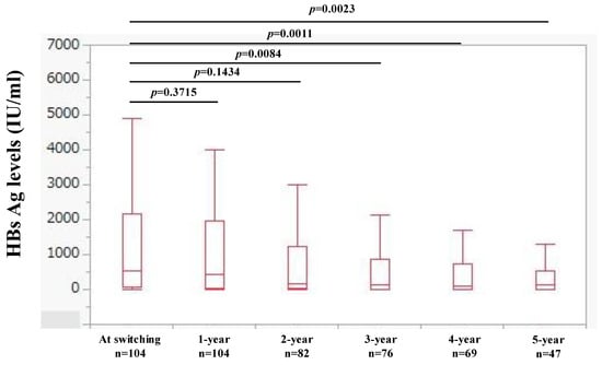 - Tamaki, N.; Kurosaki, M.; Kirino, S.; Yamashita, K.; Osawa, L.; Sekiguchi, S.; Hayakawa, Y.; Wang, W.; Okada, M.; Higuchi, M.; et al. Hepatitis B surface antigen reduction as a result of switching from long-term entecavir administration to tenofovir. JGH Open 2019, 4, 429–432. [Google Scholar] [CrossRef] [PubMed]
