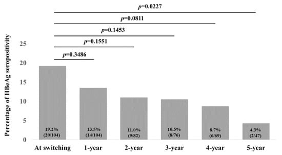 2.6. Changes in the Percentage of HBeAg Seropositivity over Time
