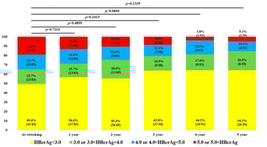 2.7. Changes in the Distribution of HBcrAg Levels over Time