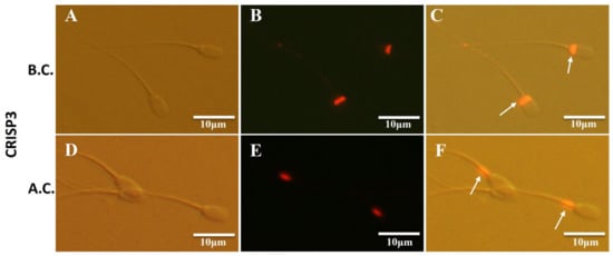 - Schambony, A.; Gentzel, M.; Wolfes, H.; Raida, M.; Neumann, U.; Topfer-Petersen, E. Equine CRISP-3: Primary structure and expression in the male genital tract. Biochim. Biophys. Acta 1998, 1387, 206–216. [Google Scholar] [CrossRef] [PubMed]