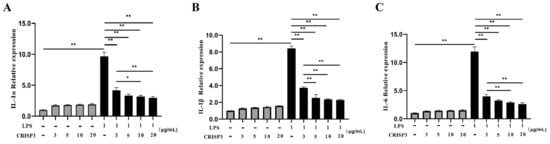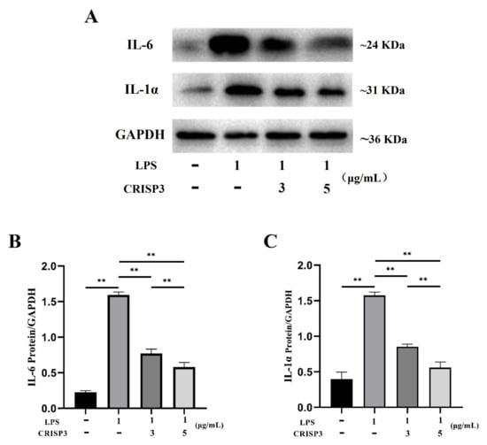 2.5. CRISP3 Protein Inhibited LPS-Induced Production of Inflammatory Factors in RAW264.7 Cells