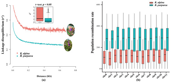 To obtain insight into natural selection patterns and historical aspects of population growth, genome-wide patterns of linkage disequilibrium (LD) were determined. The average r square (r2) in the LD tended to decrease with increasing distances between pairwise single-nucleotide polymorphisms (SNPs), with a rapidly declining trend observed over the first 0.2 kb. The LD decay of R. alpina and R. purpurea revealed a similar declining trend (Figure 1a). However, a significant difference in r2 was observed over the same distance between the two species (p < 0.05). The highest r2 of R. alpina (approximately 0.8) was in the short-distance bin <300 bp, and it declined to the lowest r2 (approximately 0.45) at the longest-distance of approximately 0.7 kb. The highest r2 of R. purpurea (approximately 0.56) was in the short-distance bin <300 bp, and it declined to the lowest r2 (approximately 0.26) in the longest-distance bin of approximately 0.65 kb. The t-test results of the mean r2 in each 1 kb bin showed a significant difference between the two species (Figure 1a). The population recombination rates corresponding to LD decay indicated a higher recombination rate in R. purpurea on 12 chromosomes than in R. alpina (Figure 1b).