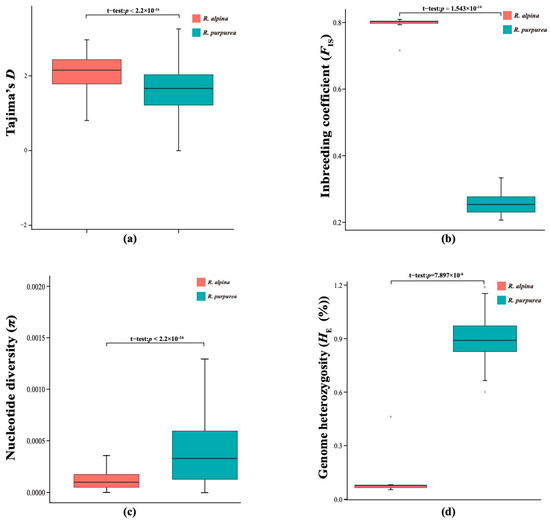 Tajima’s D, π, FIS, and genome heterozygosity (HE) were used as indicators of genetic diversity; they were compared between R. purpurea and R. alpina. The results indicate that R. alpina has lower genetic variation than R. purpurea. Tajima’s D and FIS of R. alpina were significantly higher than those of R. purpurea (Figure 2a,b), whereas π and HE of R. alpina were significantly lower than those of R. alpina (Figure 2c,d).