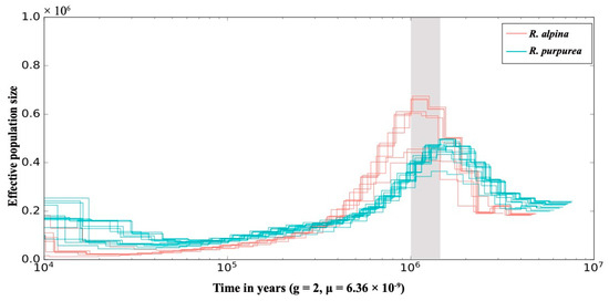 Different individuals of each species had a similar demographic history, but it was significantly different between R. purpurea and R. alpina (Figure 3). During the 1.6–1.0 Ma period, the effective population size of R. alpina was greater than that of R. purpurea. The effective population size of R. purpurea began to decline around 1.5 Ma, and the decline lasted until approximately 50,000 years ago. The effective population size of R. alpina started to decline sharply at approximately 1.0 Ma and declined until approximately 15,000 years ago. Approximately 10,000 years ago, the effective population size of R. purpurea was twice that of R. alpina.