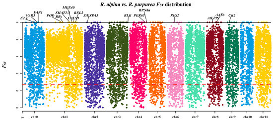 Manhattan plot of genome-wide FST between R. alpina and R. purpurea on each of the 12 chromosomes. The red dashed line indicates FST = 0.25 and the black solid line indicates FST = 1.