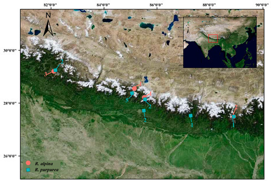 Seven individuals of R. alpina and thirteen individuals of R. purpurea were collected from wild populations in the Himalayas (Figure 5, Table S6). To obtain a sufficient number of SNPs, a whole-genome resequencing depth greater than 30× was adopted for SNP extraction. For genome sequencing, at least 5 μg of genomic DNA was extracted from fresh leaves by using the cetyltrimethylammonium bromide (CTAB) method [85]. DNA libraries were constructed and barcoded by using the DNA Library Prep Reference Guide (Illumina, Inc., San Diego, CA, USA). After sequencing on the Illumina Hiseq X Ten platform, 150 paired-end whole-genome sequencing reads with an insert size of 350 bp were obtained. The average sequencing depth was >30×, and 1072 Gb of raw sequencing data were obtained, with an average of 53.60 Gb per sample (Table S6).