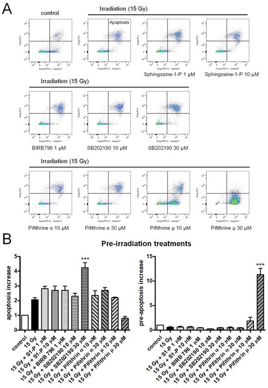 To investigate which apoptotic pathway may be involved in HPMECs, the effects of sphingosine-1-P (an antagonist of the ceramide pathway) as well as p38 MAP kinases and p53 inhibitors pre-treatment have been tested on the irradiation-induced apoptosis of HPMECs [,,,,,]. As shown in Figure 1, even a high concentration of sphingosine-1-P (10 µM) did not significantly reduce irradiation-induced apoptosis in HPMECs []. The p38MAP kinase inhibitors SB202190 and BIRB796 also failed to inhibit irradiation-induced apoptosis in HPMECs (Figure 1) [,]. Finally, the p53 inhibitors Pifithrin α and µ, that block p53-dependent transcriptional activity and p53 binding to mitochondria, respectively, did not protect HPMECs from irradiation-induced apoptosis [,,]. The p53 inhibitor Pifithrin µ appeared to worsen irradiation-induced pre-apoptosis as a clear increase in the fraction of Annexin V+ cells was observed (Figure 1).