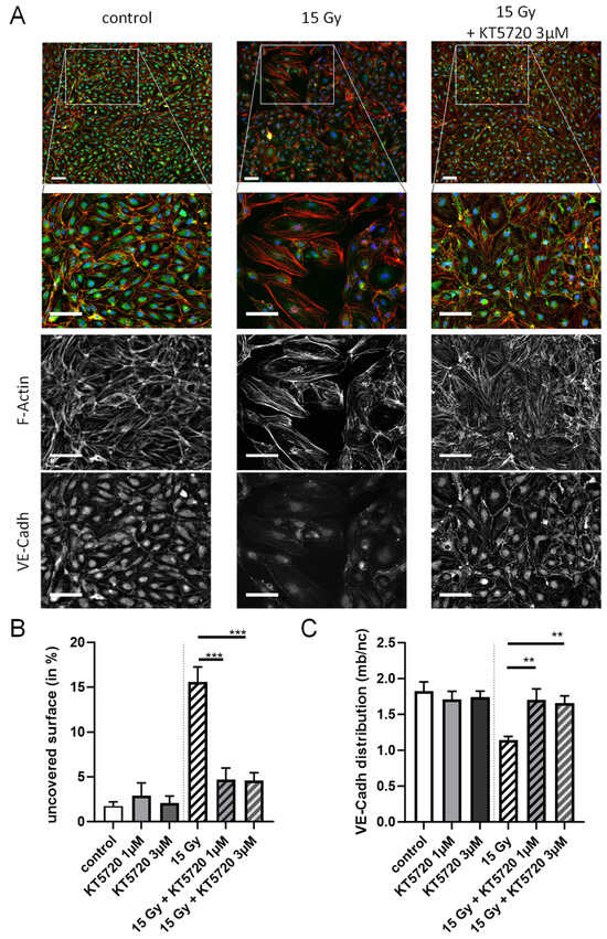 To examine the long-term impacts of high-dose irradiation (15 Gy) on the actin cytoskeleton and adherens junctions of confluent endothelial monolayers, HPMECs were stained with both Phalloidin and an anti-VE-Cadherin antibody 72 h after irradiation (Figure 3). While the non-irradiated endothelial monolayer (control) appears rather homogeneous and continuous with rare intercellular spaces, high-dose-irradiated endothelial monolayers exhibited extensive areas of missing cells (Figure 3A). As a consequence, the percentage of surface not covered by cells (uncovered surface) was significantly increased in irradiated endothelial monolayers compared to the control (Figure 3B). Importantly, the post-irradiation treatment of endothelial monolayers with KT5720 (1 and 3 µM) significantly reduced the uncovered surface to values similar to the non-irradiated control. This suggests that the compound offers protection against the detrimental effects of irradiation on the arrangement of endothelial monolayers. At the cellular level, high-dose irradiation (15 Gy) also caused a rearrangement of the actin cytoskeleton and the adherens junctions made of VE-Cadherin. In control cells, the actin cytoskeleton was localized mostly near the plasma membrane with low cytosolic staining corresponding to actin stress fibers. In contrast, a bright near-plasma membrane actin staining with highly stained cytosolic stress fibers was observed in high-dose-irradiated HPMECs (Figure 3A). An alteration of VE-cadherin staining was also observed in high-dose-irradiated HPMECs. Indeed, while plasma membrane VE-Cadherin staining was bright and continuous in non-irradiated cells, it becomes irregular, weak, or even absent in high-dose-irradiated HPMECs (Figure 3A). In support of these observations, the ratio between plasma membrane and nucleus area VE-Cadherin staining intensities was significantly decreased in irradiated endothelial monolayers, suggesting that the plasma membrane expression of VE-Cadherin is decreased in HPMECs 72 h after irradiation (Figure 3C). In this case, plasma membrane VE-Cadherin may have been degraded and/or displaced from the plasma membrane toward the cytosol/nucleus area.