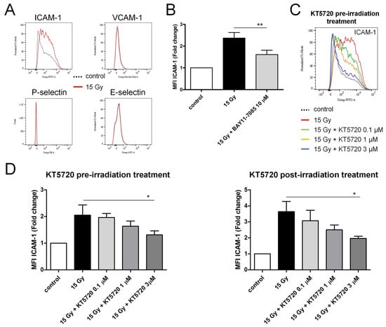 Confluent HPMECs were irradiated at a high dose (15 Gy). After 24 h, cells were detached, fixed, and the membrane expression levels of adhesion molecules (ICAM-1, VCAM-1, E-selectin, P-selectin) were measured using flow cytometry. The membrane expression level of ICAM-1 increased 24 h after irradiation, while it remained unchanged for the other adhesion molecules (Figure 5A,B). The preincubation of HPMECs with BAY11-7085, an inhibitor of NF-κB, reduced the overexpression of ICAM-1 induced by irradiation, suggesting the involvement of this transcription factor in the effect of irradiation (Figure 5B) []. Furthermore, the overexpression of ICAM-1 induced by irradiation was dose-dependently reduced by treatment with KT5720 before and after irradiation (Figure 5C,D), yet the impact of KT5720 was only significant for a concentration of 3 µM.