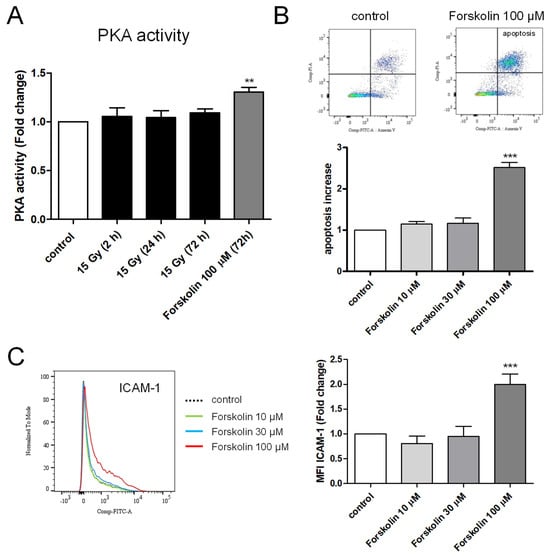 PKA activity and effect of Forskolin on apoptosis and ICAM-1 membrane expression in HPMECs. (A) PKA activity measured in control and irradiated HPMECs (2, 24, and 72 h after irradiation). Data represent the average of 3 experiments. The effect of Forskolin (100 µM, 72 h) on PKA activity is represented on the same graph. (B) Top: Effect of Forskolin (100 µM) on apoptosis of HPMECs 24 h after its addition. The color scale of graphs (blue, green and red) is linked to the number of events (cells) recorded (blue: isolated events, green and red: superimposed events). Below: Average increases in the proportion of apoptotic cells after Forskolin (10, 30, or 100 µM) treatment of HPMECs. Data on graph represent the average of 3 experiments (*** p < 0.001). (C) Left: Merged histograms of ICAM-1 staining in control and in HPMECs treated with Forskolin (10, 30, or 100 µM) for 24 h. Right: Average normalized MFI values obtained for ICAM-1 staining in Forskolin-treated HPMECs. Data on graphs represent the average of 4 experiments (** p < 0.01, *** p < 0.001).