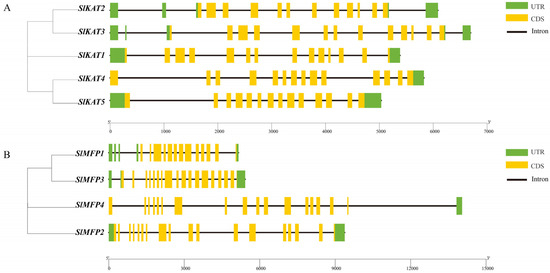 Figure 1. Exon–intron structure of tomato SlKAT and SlMFP genes. (A) The exon–intron mapping of tomato KAT genes using TBtools. Green rectangles represent exons and orange rectangles represent upstream and downstream noncoding regions of genes. Black solid lines represent introns. (B) The exon–intron mapping of tomato MFP genes using TBtools. Green rectangles represent exons and orange rectangles represent upstream and downstream noncoding regions of genes. Solid black lines represent introns.