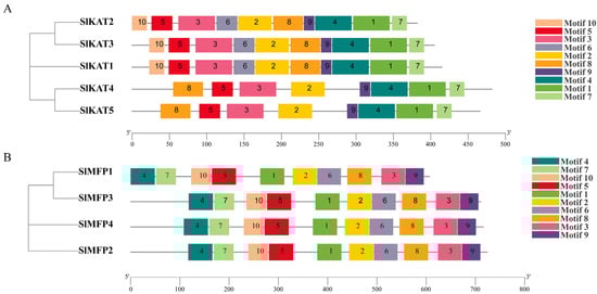 Figure 2. Composition of conserved motifs in tomato KAT and MFP proteins. (A) Sequence analysis of the tomato KAT family. Different colors represent different conserved motifs. (B) Sequence analysis of the tomato MFP family. Different colors represent different conserved motifs.
