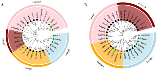 The KAT and MFP protein sequences of A. thaliana, cucumber, and Populus tomentosa were downloaded via the online database TAIR and Phytozome v13 (https://phytozome.jgi.doe.gov/pz/ (accessed on 13 May 2023)). The phylogenetic trees containing 30 KAT protein sequences and 33 MFP protein sequences were, respectively, constructed using the neighbor-joining method in MEGA 7.0 software (v7.0.26) (Bootstrap parameter set to 1000) [51]. Additionally, the EvolView (https://evolgenius.info//evolview-v2/#login (accessed on 13 May 2023)) website was used to beautify the evolutionary trees.