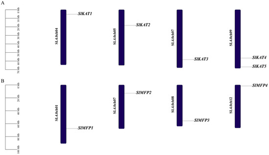 Figure 4. Chromosomal distribution of members of the SlKAT and SlMFP family genes in the tomato. (A) Chromosomal localization of KAT genes. (B) Chromosomal localization of MFP genes.