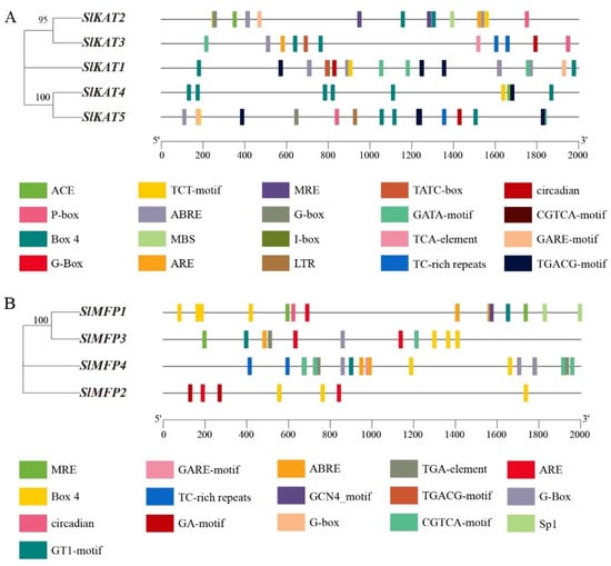 Figure 5. The distribution of cis-acting elements in the tomato SlKAT and SlMFP genes. Different colors represent different cis-acting elements. (A) The distribution of cis-acting elements in the KAT family genes. (B) The distribution of cis-acting elements in the MFP family genes.