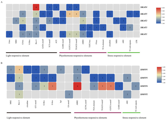 Figure 6. Analysis of the number of cis-acting elements of the tomato SlKAT and SlMFP genes. (A) Analysis of the number of cis-acting elements of the KAT gene. (B) Analysis of the number of cis-acting elements of the MFP gene.