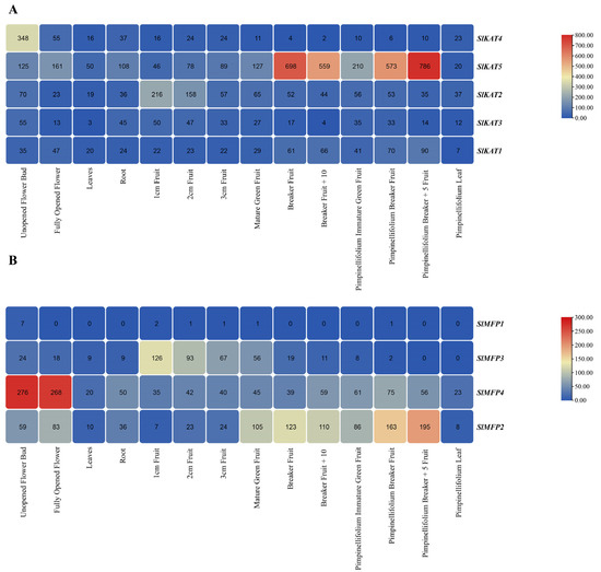 Figure 7. Expression patterns of tomato SlKAT and SlMFP in different tissues. The color scale represents the fold change normalized by the log2-transformed data. Different numbers represent the level of significance. Heatmaps are shown in blue/yellow/red for low/medium/high expression, respectively. (A) Expression of tomato SlKAT in different tissues of tomato plants. (B) Expression of tomato SlMFP in different tissues of tomato plants.